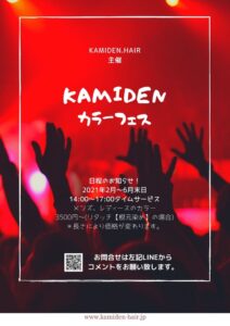 KAMIDEN.hairは2月よりカラーフェスのイベントを行います。 男女どちらでも対応可能。 根元の白髪気になる方格安でカラーを行います。